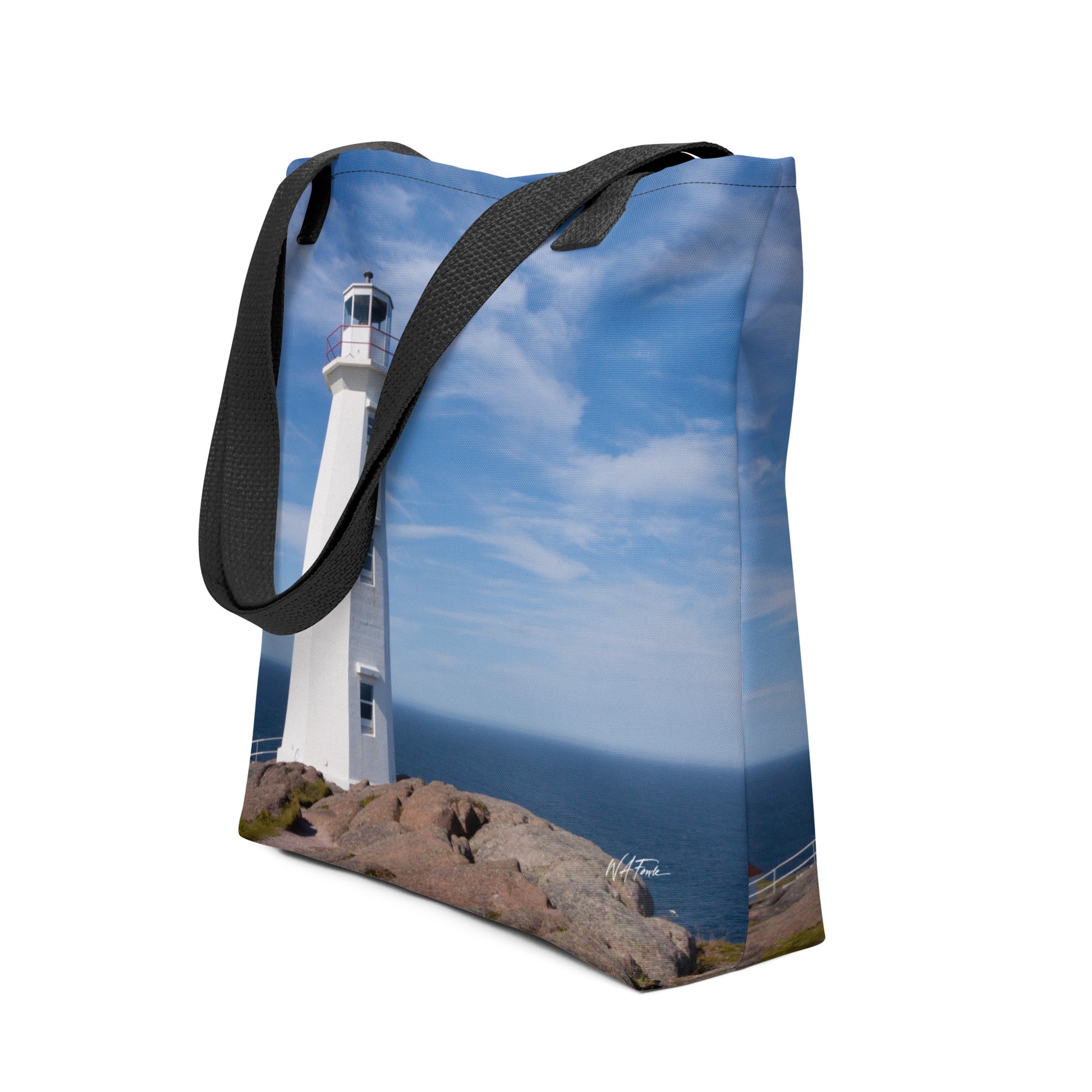 Carry a piece of the edge of the world with you. This durable and stylish shopping bag features a stunning, high-definition photograph of the iconic Cape Spear Lighthouse, the most easterly point in North America. Set against the deep blue Atlantic and the rugged cliffs of Newfoundland, this bag captures the serene and historic spirit of the Canadian coastline.
