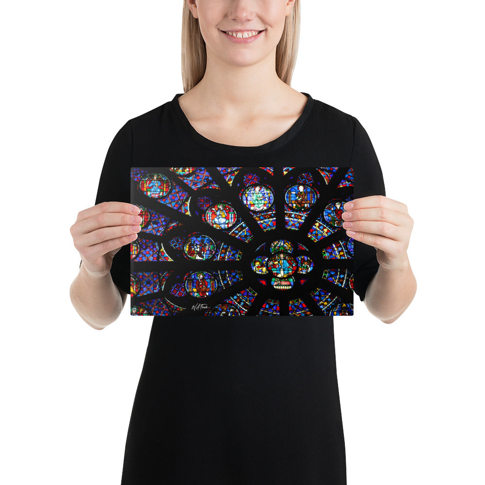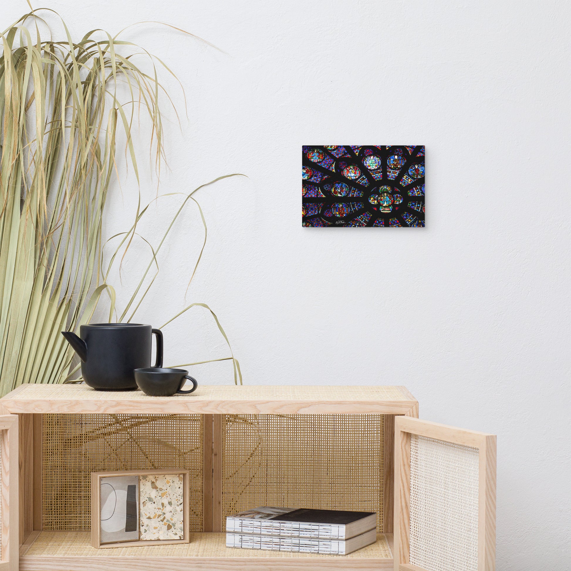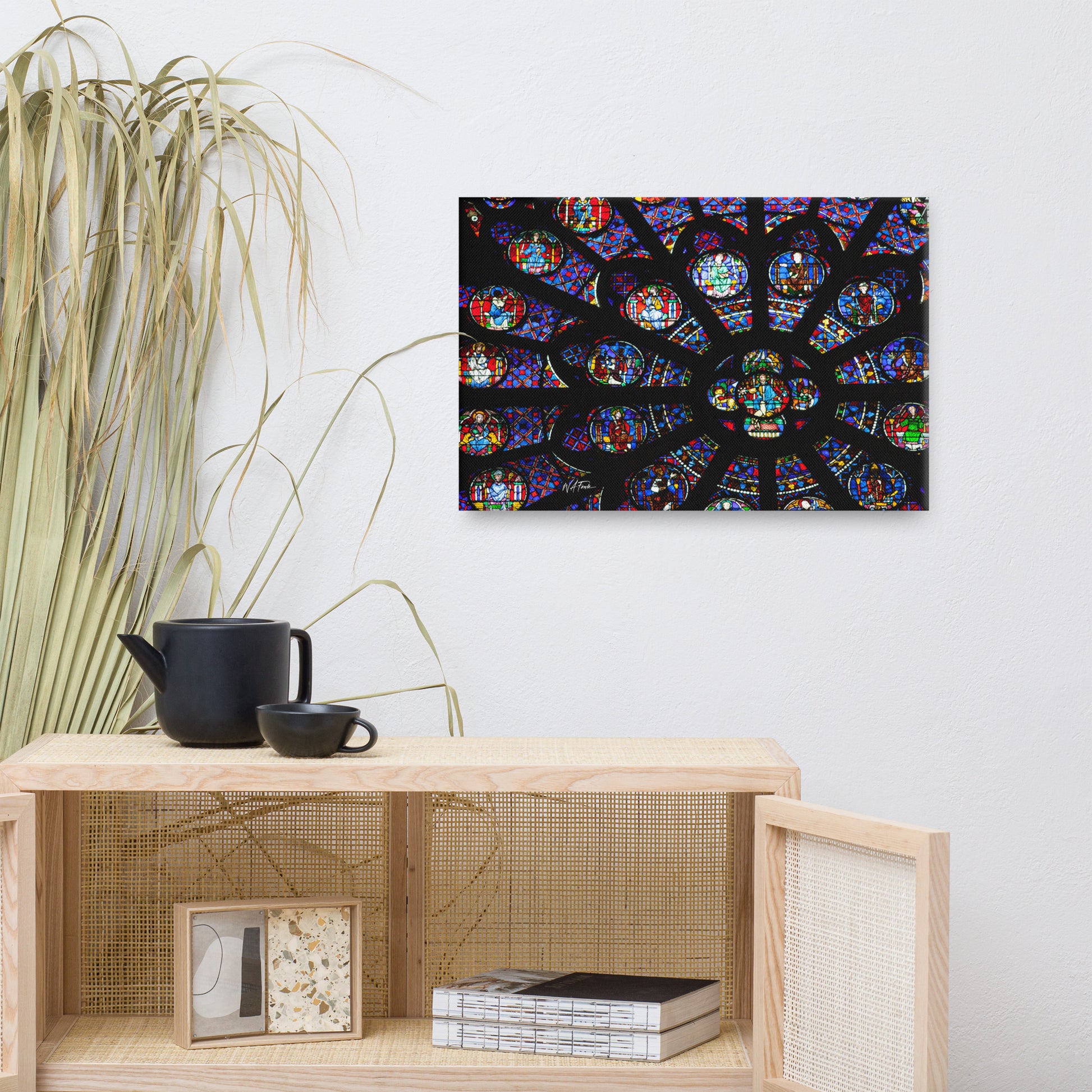 By focusing on the symmetry and storytelling within the glass, this piece transforms a historic architectural marvel into a vibrant work of contemporary fine art. Whether displayed in a sunlit living area or a quiet study, this canvas offers a timeless connection to French heritage and Gothic craftsmanship.